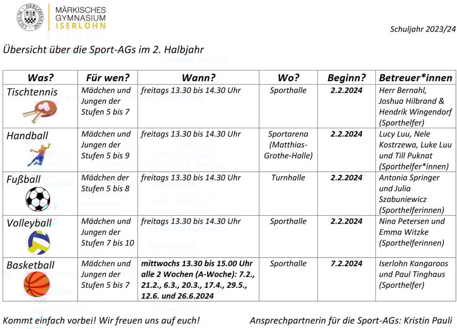 Schuljahr 2023/24 · 28. Januar 2024 Übersicht über die Sport-AGs im 2. Halbjahr Übersicht über die Sport-AGs im 2. Halbjahr des Schuljahres 2023/24. Sport-AG-Angebot_2023-24_2. Hj_Homepage. Adobe Acrobat Dokument 210.7 KB Download tagPlaceholderTags: